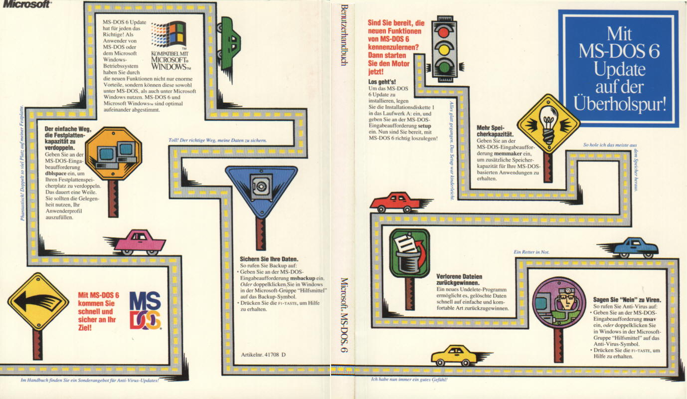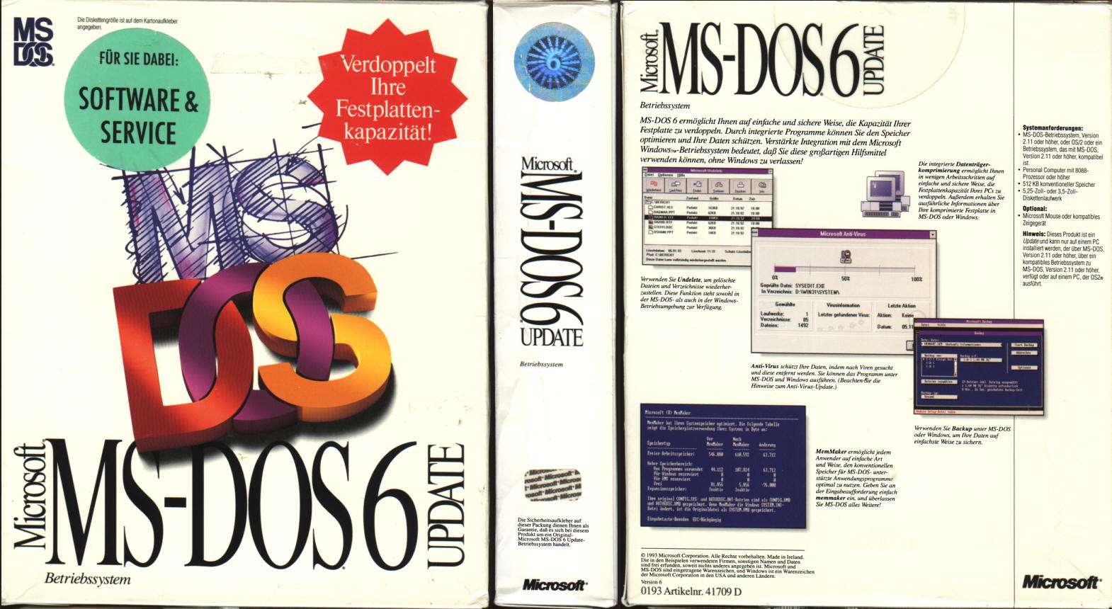 This was a catch-up with Novell’s DR-DOS 6. It added a disk-compression utility called DoubleSpace, a basic anti-virus program and a disk defragmenter. It also finally included a MOVE command, an improved backup program, MSBACKUP and multiple boot configurations. Memory management was also improved by the addition of MEMMAKER. A number of older utilities, such as JOIN and RECOVER were removed. The DOS Shell was released separately as Microsoft felt that there were too many disks. Also the support for CD-ROM were added.
